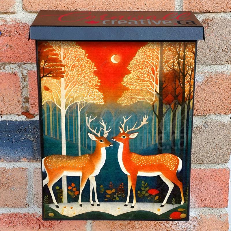 Enhance your Mailbox and your neighborhood with this brilliant Deer Couple in the Fairytale Forest Colonial magnetic or self adhesive vinyl Mailbox Cover. Our magnetic covers feature a complete magnetic surface throughout the entire design, unlike lower-quality options that only incorporate two magnet strips combined with a piece of canvas. This ensures better functionality and a more reliable, stronger hold against the wind, also these covers have an additional UV protection, so your covers will not fade for many years. We offer self-adhesive and magnetic covers with both standard opaque vinyl or reflective vinyl options. The reflective mailbox covers function just like license plates and road signs, ensuring excellent visibility during nighttime. No matter the size of your mailbox, we make covers for all box sizes to suit your needs perfectly!