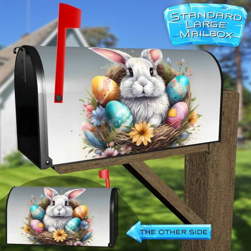Revamp your Mailbox and your neighborhood with this brilliant Easter Bunny in the Nest curbside / rural / farm magnetic or self adhesive vinyl Mailbox Cover. Our magnetic covers feature a complete magnetic surface throughout the entire design, unlike lower-quality options that only incorporate two magnet strips combined with a piece of canvas. This ensures better functionality and a more reliable, stronger hold against the wind, also these covers have an additional UV protection, so your covers will not fade for many years. We offer self-adhesive and magnetic covers with both standard opaque vinyl or reflective vinyl options. The reflective mailbox covers function just like license plates and road signs, ensuring excellent visibility during nighttime. No matter the size of your mailbox, we make covers for all small, large and jumbo boxes to suit your needs perfectly!