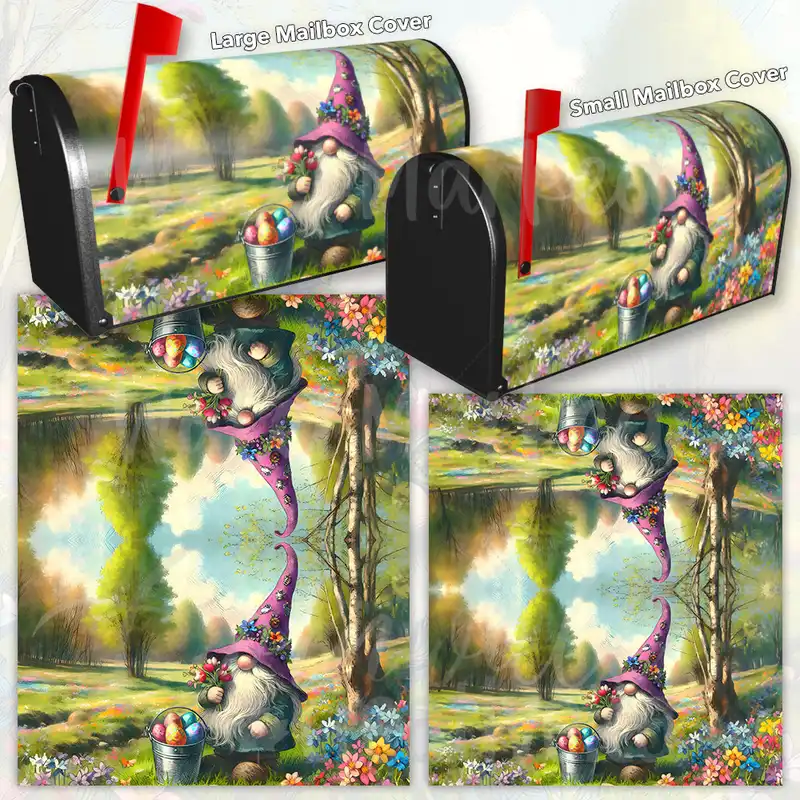 Glamorize your Mailbox and your neighborhood with this brilliant Easter Gnome with Flowers curbside / rural / farm magnetic or self adhesive vinyl Mailbox Cover. Our magnetic covers feature a complete magnetic surface throughout the entire design, unlike lower-quality options that only incorporate two magnet strips combined with a piece of canvas. This ensures better functionality and a more reliable, stronger hold against the wind, also these covers have an additional UV protection, so your covers will not fade for many years. We offer self-adhesive and magnetic covers with both standard opaque vinyl or reflective vinyl options. The reflective mailbox covers function just like license plates and road signs, ensuring excellent visibility during nighttime. No matter the size of your mailbox, we make covers for all small, large and jumbo boxes to suit your needs perfectly!