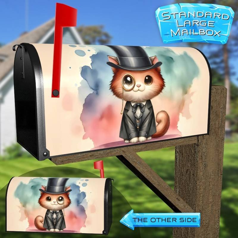 Spruce up your Mailbox and your neighborhood with this brilliant Elegant Cat Gentleman curbside / rural / farm magnetic or self adhesive vinyl Mailbox Cover. Our magnetic covers feature a complete magnetic surface throughout the entire design, unlike lower-quality options that only incorporate two magnet strips combined with a piece of canvas. This ensures better functionality and a more reliable, stronger hold against the wind, also these covers have an additional UV protection, so your covers will not fade for many years. We offer self-adhesive and magnetic covers with both standard opaque vinyl or reflective vinyl options. The reflective mailbox covers function just like license plates and road signs, ensuring excellent visibility during nighttime. No matter the size of your mailbox, we make covers for all small, large and jumbo boxes to suit your needs perfectly!