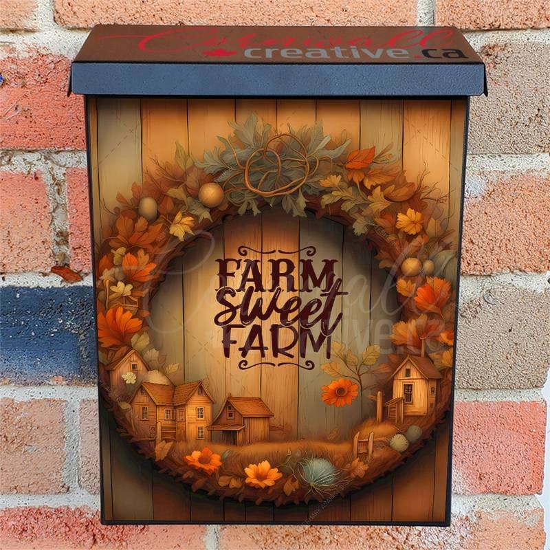 Lift your Mailbox and your neighborhood with this brilliant Farm Sweet Farm Wreath Colonial magnetic or self adhesive vinyl Mailbox Cover. Our magnetic covers feature a complete magnetic surface throughout the entire design, unlike lower-quality options that only incorporate two magnet strips combined with a piece of canvas. This ensures better functionality and a more reliable, stronger hold against the wind, also these covers have an additional UV protection, so your covers will not fade for many years. We offer self-adhesive and magnetic covers with both standard opaque vinyl or reflective vinyl options. The reflective mailbox covers function just like license plates and road signs, ensuring excellent visibility during nighttime. No matter the size of your mailbox, we make covers for all box sizes to suit your needs perfectly!