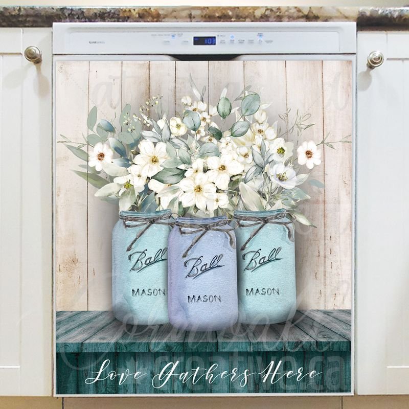 Lift your kitchen effortlessly with this stunning Farmhouse Mason Jars and Flowers Magnetic Dishwasher Door Cover! Keep in mind that while this cover works with most dishwashers, some stainless steel and plastic doors might not hold magnets. There are two types of stainless steel: one that attracts magnets well and another that does not, and plastic doors will definitely not work with magnets. So, it is a good idea to test the surface with a magnet before making a purchase. If your dishwasher door is not compatible, consider opting for the Removable Dishwasher Door Sticker instead. Your improved kitchen will be ready for the season in no time! Keep in mind that this magnetic cover is versatile and can be used on a variety of appliances, including fridges, freezers, washers, dryers, and more!