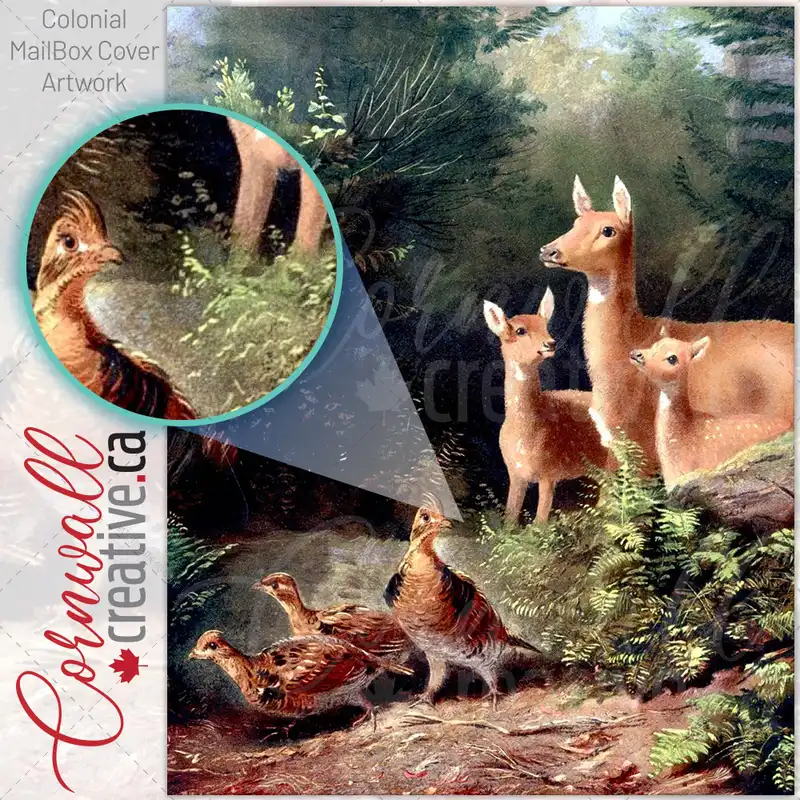 Reform your Mailbox and your neighborhood with this brilliant Fawns and Partridges Colonial magnetic or self adhesive vinyl Mailbox Cover. Our magnetic covers feature a complete magnetic surface throughout the entire design, unlike lower-quality options that only incorporate two magnet strips combined with a piece of canvas. This ensures better functionality and a more reliable, stronger hold against the wind, also these covers have an additional UV protection, so your covers will not fade for many years. We offer self-adhesive and magnetic covers with both standard opaque vinyl or reflective vinyl options. The reflective mailbox covers function just like license plates and road signs, ensuring excellent visibility during nighttime. No matter the size of your mailbox, we make covers for all box sizes to suit your needs perfectly!