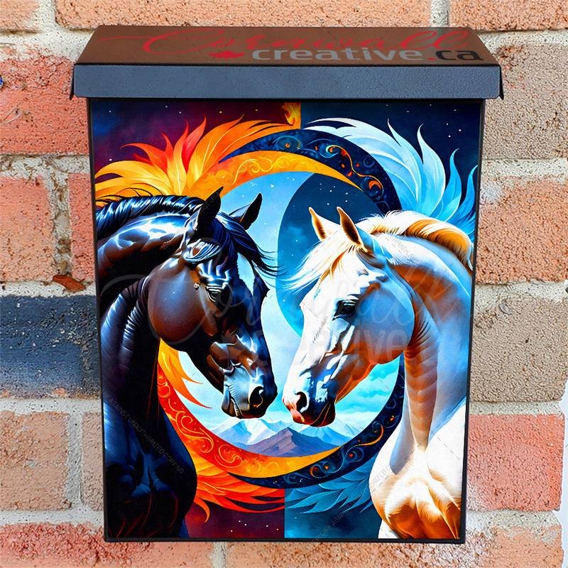 Glamorize your Mailbox and your neighborhood with this brilliant Fire and Ice Horses Colonial magnetic or self adhesive vinyl Mailbox Cover. Our magnetic covers feature a complete magnetic surface throughout the entire design, unlike lower-quality options that only incorporate two magnet strips combined with a piece of canvas. This ensures better functionality and a more reliable, stronger hold against the wind, also these covers have an additional UV protection, so your covers will not fade for many years. We offer self-adhesive and magnetic covers with both standard opaque vinyl or reflective vinyl options. The reflective mailbox covers function just like license plates and road signs, ensuring excellent visibility during nighttime. No matter the size of your mailbox, we make covers for all box sizes to suit your needs perfectly!