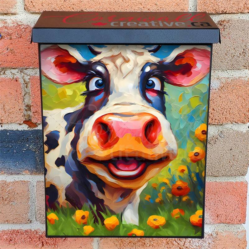 Decorate your Mailbox and your neighborhood with this brilliant Funny Silly Cow Colonial magnetic or self adhesive vinyl Mailbox Cover. Our magnetic covers feature a complete magnetic surface throughout the entire design, unlike lower-quality options that only incorporate two magnet strips combined with a piece of canvas. This ensures better functionality and a more reliable, stronger hold against the wind, also these covers have an additional UV protection, so your covers will not fade for many years. We offer self-adhesive and magnetic covers with both standard opaque vinyl or reflective vinyl options. The reflective mailbox covers function just like license plates and road signs, ensuring excellent visibility during nighttime. No matter the size of your mailbox, we make covers for all box sizes to suit your needs perfectly!