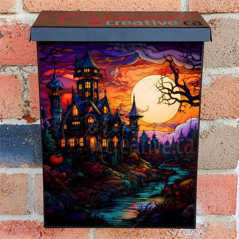 Enhance your Mailbox and your neighborhood with this brilliant Halloween Castle and Full Moon Colonial magnetic or self adhesive vinyl Mailbox Cover. Our magnetic covers feature a complete magnetic surface throughout the entire design, unlike lower-quality options that only incorporate two magnet strips combined with a piece of canvas. This ensures better functionality and a more reliable, stronger hold against the wind, also these covers have an additional UV protection, so your covers will not fade for many years. We offer self-adhesive and magnetic covers with both standard opaque vinyl or reflective vinyl options. The reflective mailbox covers function just like license plates and road signs, ensuring excellent visibility during nighttime. No matter the size of your mailbox, we make covers for all box sizes to suit your needs perfectly!
