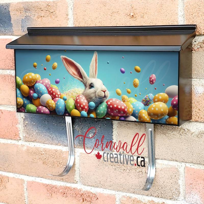 Applying your Happy Easter Bunny With Many Colorful Easter Eggs wall-mounted townhouse / ranch mailbox cover it is pretty easy to transform your mailbox to a special and unique item. These covers require a flat surface, so they work with townhouse / ranch mailboxes that do not have any embossed / debossed decoration or signs. Magnetic mailbox covers work with steel boxes only, for aluminum and plastic boxes we offer the self-adhesive vinyl covers. Also, you can create your custom townhouse / ranch mailbox cover using you own pictures, adding your name, street number, etc. Our magnetic covers feature a complete magnetic surface throughout the entire design, unlike lower-quality options that only incorporate two magnet strips combined with a piece of canvas. This ensures better functionality and a more reliable, stronger hold against the wind, also these covers have an additional UV protection, so your covers will not fade for many years. The reflective mailbox covers function just like license plates and road signs, ensuring excellent visibility during nighttime.
