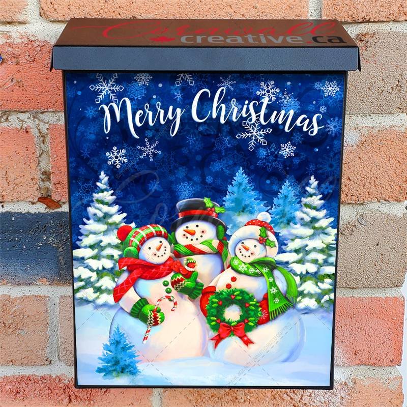 Lift your Mailbox and your neighborhood with this brilliant Happy Snowman Family Colonial magnetic or self adhesive vinyl Mailbox Cover. Our magnetic covers feature a complete magnetic surface throughout the entire design, unlike lower-quality options that only incorporate two magnet strips combined with a piece of canvas. This ensures better functionality and a more reliable, stronger hold against the wind, also these covers have an additional UV protection, so your covers will not fade for many years. We offer self-adhesive and magnetic covers with both standard opaque vinyl or reflective vinyl options. The reflective mailbox covers function just like license plates and road signs, ensuring excellent visibility during nighttime. No matter the size of your mailbox, we make covers for all box sizes to suit your needs perfectly!