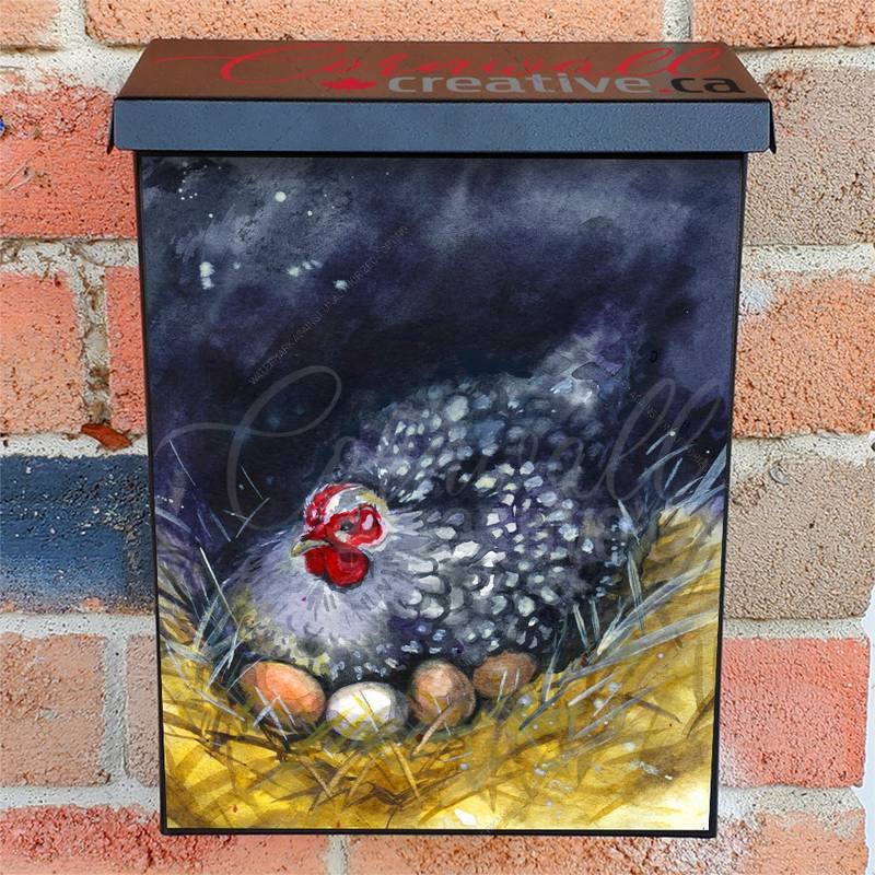 Lift your Mailbox and your neighborhood with this brilliant Hen on the Nest Colonial magnetic or self adhesive vinyl Mailbox Cover. Our magnetic covers feature a complete magnetic surface throughout the entire design, unlike lower-quality options that only incorporate two magnet strips combined with a piece of canvas. This ensures better functionality and a more reliable, stronger hold against the wind, also these covers have an additional UV protection, so your covers will not fade for many years. We offer self-adhesive and magnetic covers with both standard opaque vinyl or reflective vinyl options. The reflective mailbox covers function just like license plates and road signs, ensuring excellent visibility during nighttime. No matter the size of your mailbox, we make covers for all box sizes to suit your needs perfectly!