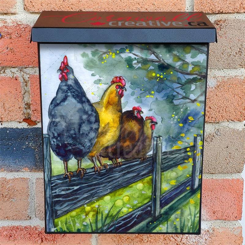 Reform your Mailbox and your neighborhood with this brilliant Hens Sitting on the Fence Colonial magnetic or self adhesive vinyl Mailbox Cover. Our magnetic covers feature a complete magnetic surface throughout the entire design, unlike lower-quality options that only incorporate two magnet strips combined with a piece of canvas. This ensures better functionality and a more reliable, stronger hold against the wind, also these covers have an additional UV protection, so your covers will not fade for many years. We offer self-adhesive and magnetic covers with both standard opaque vinyl or reflective vinyl options. The reflective mailbox covers function just like license plates and road signs, ensuring excellent visibility during nighttime. No matter the size of your mailbox, we make covers for all box sizes to suit your needs perfectly!