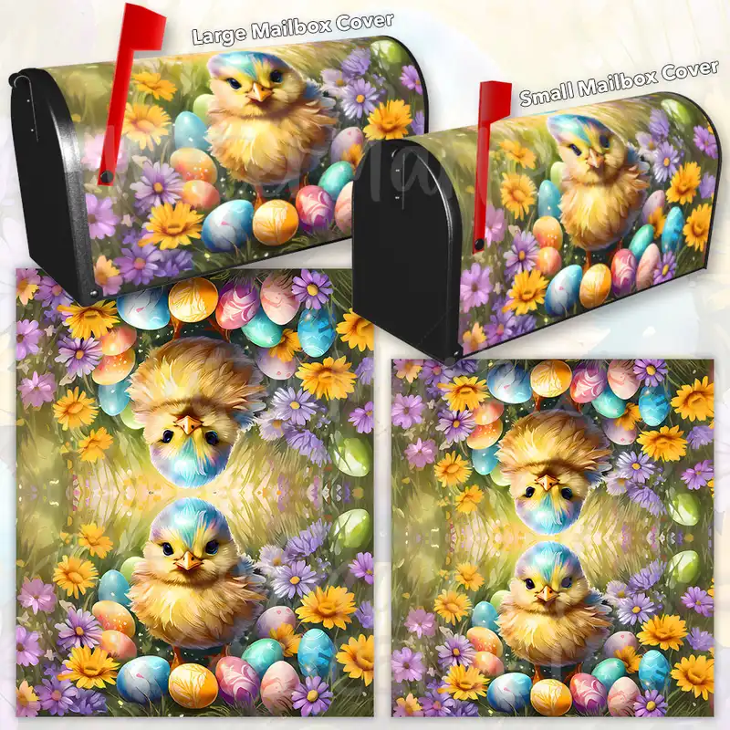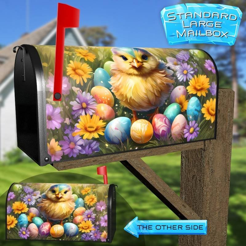 Revamp your Mailbox and your neighborhood with this brilliant Little Easter Chick with Eggs curbside / rural / farm magnetic or self adhesive vinyl Mailbox Cover. Our magnetic covers feature a complete magnetic surface throughout the entire design, unlike lower-quality options that only incorporate two magnet strips combined with a piece of canvas. This ensures better functionality and a more reliable, stronger hold against the wind, also these covers have an additional UV protection, so your covers will not fade for many years. We offer self-adhesive and magnetic covers with both standard opaque vinyl or reflective vinyl options. The reflective mailbox covers function just like license plates and road signs, ensuring excellent visibility during nighttime. No matter the size of your mailbox, we make covers for all small, large and jumbo boxes to suit your needs perfectly!