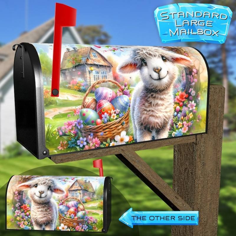 Gussy up your Mailbox and your neighborhood with this brilliant Little Easter Lamb 2 curbside / rural / farm magnetic or self adhesive vinyl Mailbox Cover. Our magnetic covers feature a complete magnetic surface throughout the entire design, unlike lower-quality options that only incorporate two magnet strips combined with a piece of canvas. This ensures better functionality and a more reliable, stronger hold against the wind, also these covers have an additional UV protection, so your covers will not fade for many years. We offer self-adhesive and magnetic covers with both standard opaque vinyl or reflective vinyl options. The reflective mailbox covers function just like license plates and road signs, ensuring excellent visibility during nighttime. No matter the size of your mailbox, we make covers for all small, large and jumbo boxes to suit your needs perfectly!