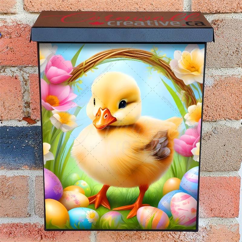 Develop your Mailbox and your neighborhood with this brilliant Lovely Easter Duck Colonial magnetic or self adhesive vinyl Mailbox Cover. Our magnetic covers feature a complete magnetic surface throughout the entire design, unlike lower-quality options that only incorporate two magnet strips combined with a piece of canvas. This ensures better functionality and a more reliable, stronger hold against the wind, also these covers have an additional UV protection, so your covers will not fade for many years. We offer self-adhesive and magnetic covers with both standard opaque vinyl or reflective vinyl options. The reflective mailbox covers function just like license plates and road signs, ensuring excellent visibility during nighttime. No matter the size of your mailbox, we make covers for all box sizes to suit your needs perfectly!