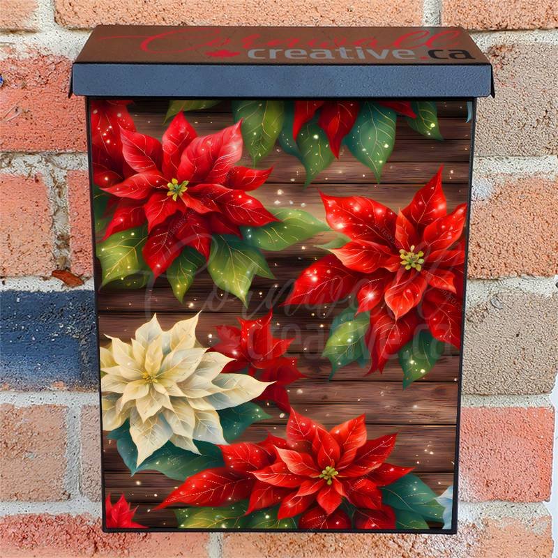 Glamorize your Mailbox and your neighborhood with this brilliant Lovely Poinsettias on Wood Colonial magnetic or self adhesive vinyl Mailbox Cover. Our magnetic covers feature a complete magnetic surface throughout the entire design, unlike lower-quality options that only incorporate two magnet strips combined with a piece of canvas. This ensures better functionality and a more reliable, stronger hold against the wind, also these covers have an additional UV protection, so your covers will not fade for many years. We offer self-adhesive and magnetic covers with both standard opaque vinyl or reflective vinyl options. The reflective mailbox covers function just like license plates and road signs, ensuring excellent visibility during nighttime. No matter the size of your mailbox, we make covers for all box sizes to suit your needs perfectly!
