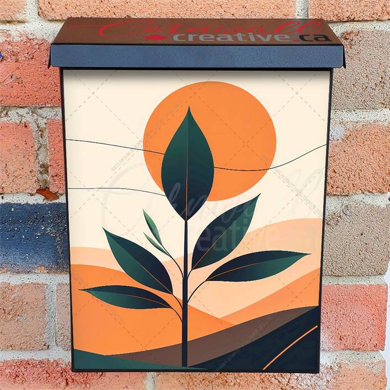 Enhance your Mailbox and your neighborhood with this brilliant Modern Art with a Plant and Sun Colonial magnetic or self adhesive vinyl Mailbox Cover. Our magnetic covers feature a complete magnetic surface throughout the entire design, unlike lower-quality options that only incorporate two magnet strips combined with a piece of canvas. This ensures better functionality and a more reliable, stronger hold against the wind, also these covers have an additional UV protection, so your covers will not fade for many years. We offer self-adhesive and magnetic covers with both standard opaque vinyl or reflective vinyl options. The reflective mailbox covers function just like license plates and road signs, ensuring excellent visibility during nighttime. No matter the size of your mailbox, we make covers for all box sizes to suit your needs perfectly!