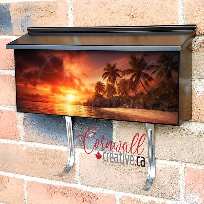 Applying your Ocean Beach Scene Of Tropical Coastline Palm Trees at Sunset wall-mounted townhouse / ranch mailbox cover it is pretty easy to beautify your mailbox to a special and unique item. These covers require a flat surface, so they work with townhouse / ranch mailboxes that do not have any embossed / debossed decoration or signs. Magnetic mailbox covers work with steel boxes only, for aluminum and plastic boxes we offer the self-adhesive vinyl covers. Also, you can create your custom townhouse / ranch mailbox cover using you own pictures, adding your name, street number, etc. Our magnetic covers feature a complete magnetic surface throughout the entire design, unlike lower-quality options that only incorporate two magnet strips combined with a piece of canvas. This ensures better functionality and a more reliable, stronger hold against the wind, also these covers have an additional UV protection, so your covers will not fade for many years. The reflective mailbox covers function just like license plates and road signs, ensuring excellent visibility during nighttime.
