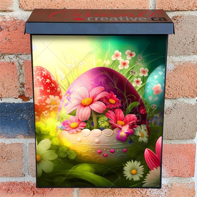 Gussy up your Mailbox and your neighborhood with this brilliant Painted Easter Eggs and Flowers #5 Colonial magnetic or self adhesive vinyl Mailbox Cover. Our magnetic covers feature a complete magnetic surface throughout the entire design, unlike lower-quality options that only incorporate two magnet strips combined with a piece of canvas. This ensures better functionality and a more reliable, stronger hold against the wind, also these covers have an additional UV protection, so your covers will not fade for many years. We offer self-adhesive and magnetic covers with both standard opaque vinyl or reflective vinyl options. The reflective mailbox covers function just like license plates and road signs, ensuring excellent visibility during nighttime. No matter the size of your mailbox, we make covers for all box sizes to suit your needs perfectly!