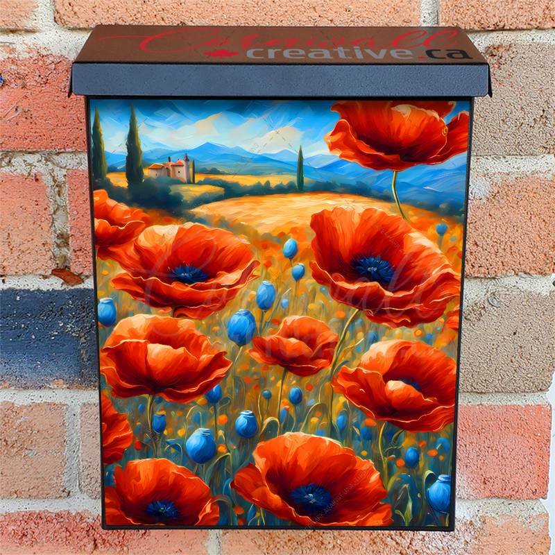 Prettify your Mailbox and your neighborhood with this brilliant Poppy Field in Tuscany 2 Colonial magnetic or self adhesive vinyl Mailbox Cover. Our magnetic covers feature a complete magnetic surface throughout the entire design, unlike lower-quality options that only incorporate two magnet strips combined with a piece of canvas. This ensures better functionality and a more reliable, stronger hold against the wind, also these covers have an additional UV protection, so your covers will not fade for many years. We offer self-adhesive and magnetic covers with both standard opaque vinyl or reflective vinyl options. The reflective mailbox covers function just like license plates and road signs, ensuring excellent visibility during nighttime. No matter the size of your mailbox, we make covers for all box sizes to suit your needs perfectly!