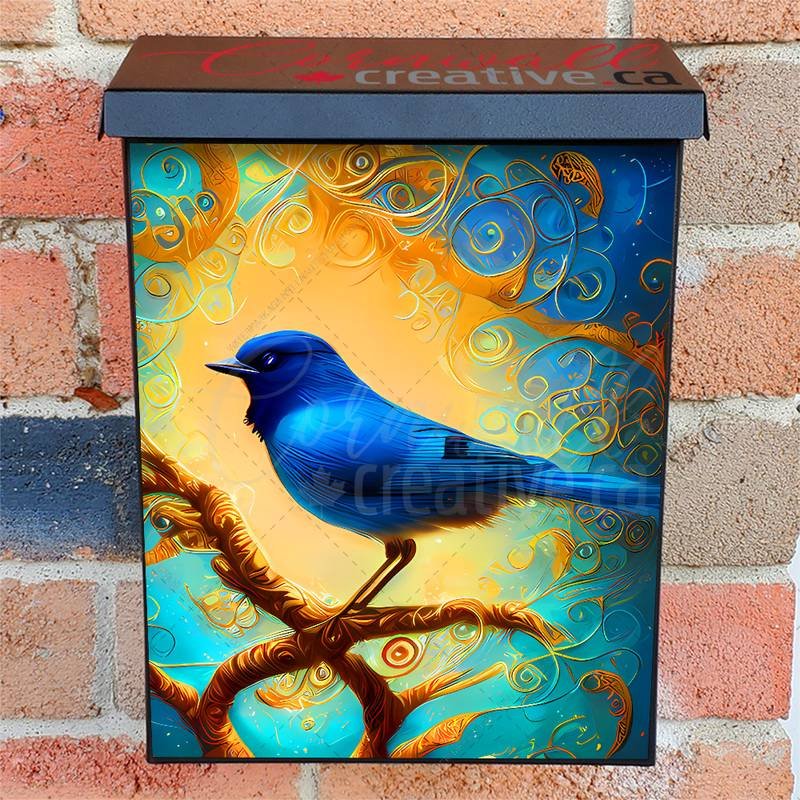 Lift your Mailbox and your neighborhood with this brilliant Pretty Blue Bird #2 Colonial magnetic or self adhesive vinyl Mailbox Cover. Our magnetic covers feature a complete magnetic surface throughout the entire design, unlike lower-quality options that only incorporate two magnet strips combined with a piece of canvas. This ensures better functionality and a more reliable, stronger hold against the wind, also these covers have an additional UV protection, so your covers will not fade for many years. We offer self-adhesive and magnetic covers with both standard opaque vinyl or reflective vinyl options. The reflective mailbox covers function just like license plates and road signs, ensuring excellent visibility during nighttime. No matter the size of your mailbox, we make covers for all box sizes to suit your needs perfectly!