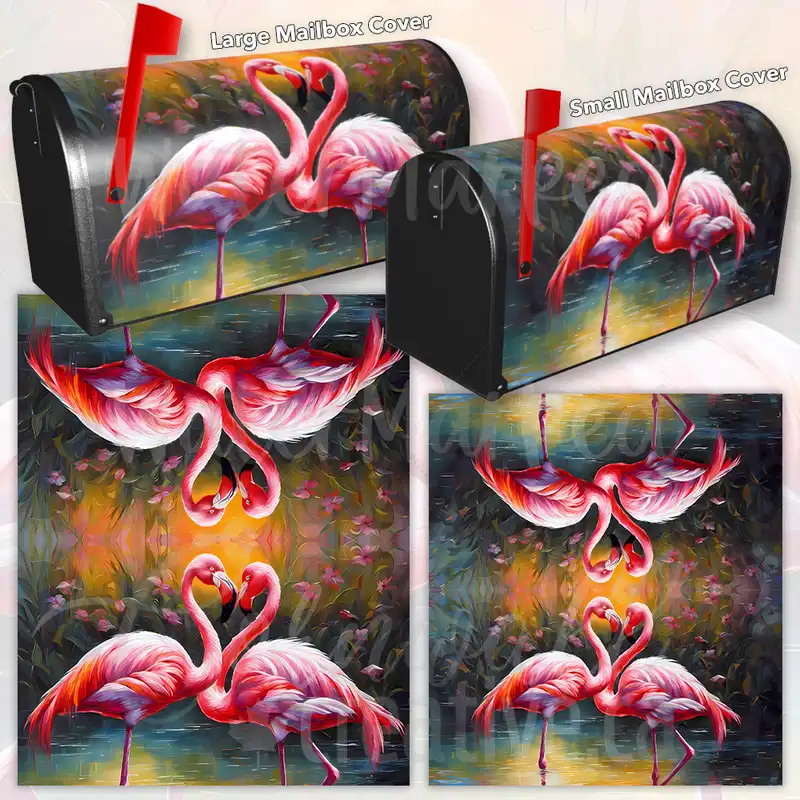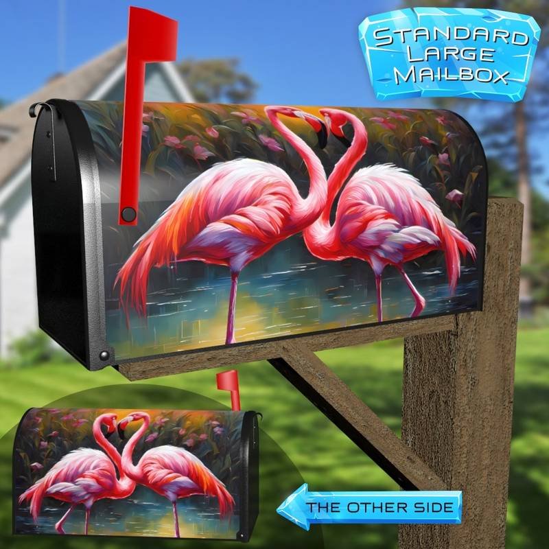 Decorate your Mailbox and your neighborhood with this brilliant Pretty Flamingo Couple 2 curbside / rural / farm magnetic or self adhesive vinyl Mailbox Cover. Our magnetic covers feature a complete magnetic surface throughout the entire design, unlike lower-quality options that only incorporate two magnet strips combined with a piece of canvas. This ensures better functionality and a more reliable, stronger hold against the wind, also these covers have an additional UV protection, so your covers will not fade for many years. We offer self-adhesive and magnetic covers with both standard opaque vinyl or reflective vinyl options. The reflective mailbox covers function just like license plates and road signs, ensuring excellent visibility during nighttime. No matter the size of your mailbox, we make covers for all small, large and jumbo boxes to suit your needs perfectly!