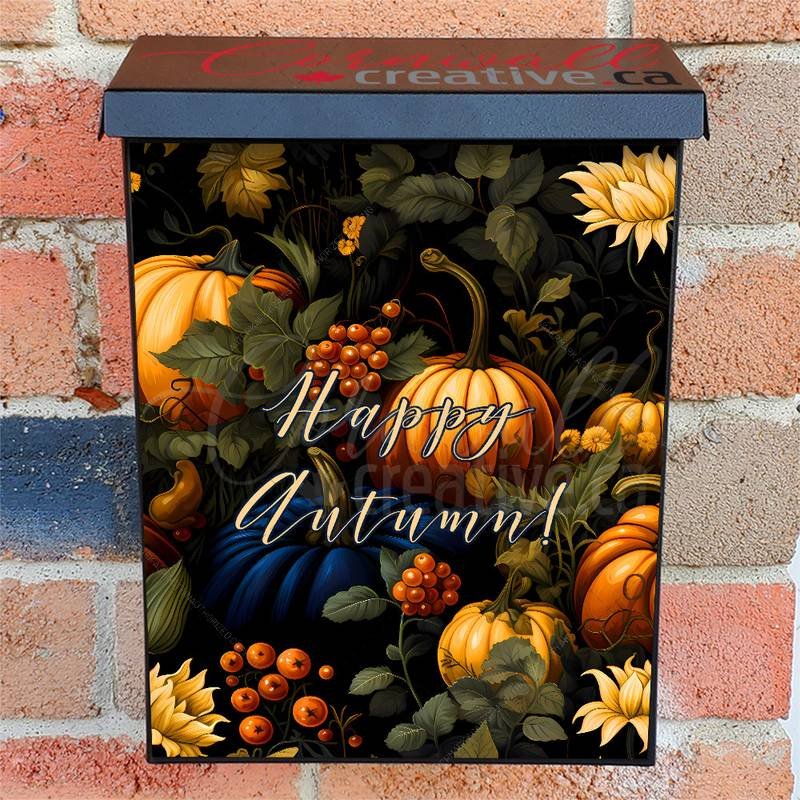Embellish your Mailbox and your neighborhood with this brilliant Pumpkins, Flowers and Berries Colonial magnetic or self adhesive vinyl Mailbox Cover. Our magnetic covers feature a complete magnetic surface throughout the entire design, unlike lower-quality options that only incorporate two magnet strips combined with a piece of canvas. This ensures better functionality and a more reliable, stronger hold against the wind, also these covers have an additional UV protection, so your covers will not fade for many years. We offer self-adhesive and magnetic covers with both standard opaque vinyl or reflective vinyl options. The reflective mailbox covers function just like license plates and road signs, ensuring excellent visibility during nighttime. No matter the size of your mailbox, we make covers for all box sizes to suit your needs perfectly!