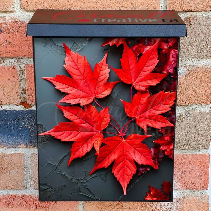 Prettify your Mailbox and your neighborhood with this brilliant Red Maple Leaves On Rough Black Background Colonial magnetic or self adhesive vinyl Mailbox Cover. Our magnetic covers feature a complete magnetic surface throughout the entire design, unlike lower-quality options that only incorporate two magnet strips combined with a piece of canvas. This ensures better functionality and a more reliable, stronger hold against the wind, also these covers have an additional UV protection, so your covers will not fade for many years. We offer self-adhesive and magnetic covers with both standard opaque vinyl or reflective vinyl options. The reflective mailbox covers function just like license plates and road signs, ensuring excellent visibility during nighttime. No matter the size of your mailbox, we make covers for all box sizes to suit your needs perfectly!