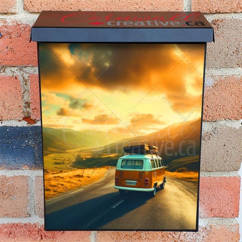Dress-up your Mailbox and your neighborhood with this brilliant Retro Van In Mountain Landscape Road Trip Colonial magnetic or self adhesive vinyl Mailbox Cover. Our magnetic covers feature a complete magnetic surface throughout the entire design, unlike lower-quality options that only incorporate two magnet strips combined with a piece of canvas. This ensures better functionality and a more reliable, stronger hold against the wind, also these covers have an additional UV protection, so your covers will not fade for many years. We offer self-adhesive and magnetic covers with both standard opaque vinyl or reflective vinyl options. The reflective mailbox covers function just like license plates and road signs, ensuring excellent visibility during nighttime. No matter the size of your mailbox, we make covers for all box sizes to suit your needs perfectly!