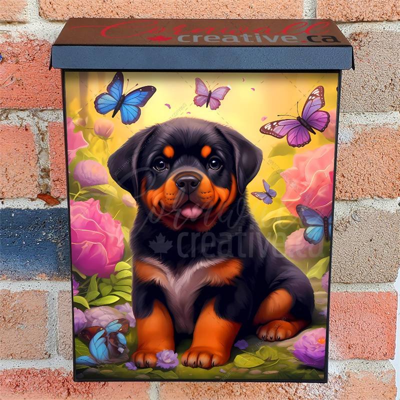 Adorn your Mailbox and your neighborhood with this brilliant Rottweiler Puppy and Butterflies Colonial magnetic or self adhesive vinyl Mailbox Cover. Our magnetic covers feature a complete magnetic surface throughout the entire design, unlike lower-quality options that only incorporate two magnet strips combined with a piece of canvas. This ensures better functionality and a more reliable, stronger hold against the wind, also these covers have an additional UV protection, so your covers will not fade for many years. We offer self-adhesive and magnetic covers with both standard opaque vinyl or reflective vinyl options. The reflective mailbox covers function just like license plates and road signs, ensuring excellent visibility during nighttime. No matter the size of your mailbox, we make covers for all box sizes to suit your needs perfectly!