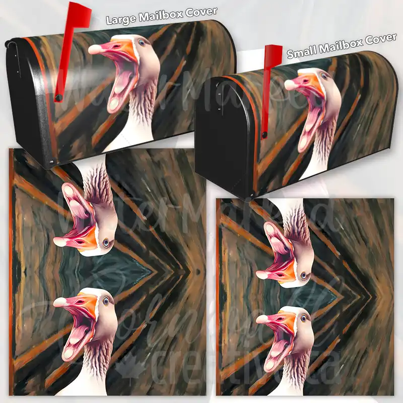 Improve your Mailbox and your neighborhood with this brilliant Scream by Edvard Munch with a Goose curbside / rural / farm magnetic or self adhesive vinyl Mailbox Cover. Our magnetic covers feature a complete magnetic surface throughout the entire design, unlike lower-quality options that only incorporate two magnet strips combined with a piece of canvas. This ensures better functionality and a more reliable, stronger hold against the wind, also these covers have an additional UV protection, so your covers will not fade for many years. We offer self-adhesive and magnetic covers with both standard opaque vinyl or reflective vinyl options. The reflective mailbox covers function just like license plates and road signs, ensuring excellent visibility during nighttime. No matter the size of your mailbox, we make covers for all small, large and jumbo boxes to suit your needs perfectly!