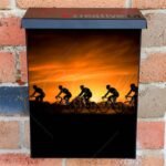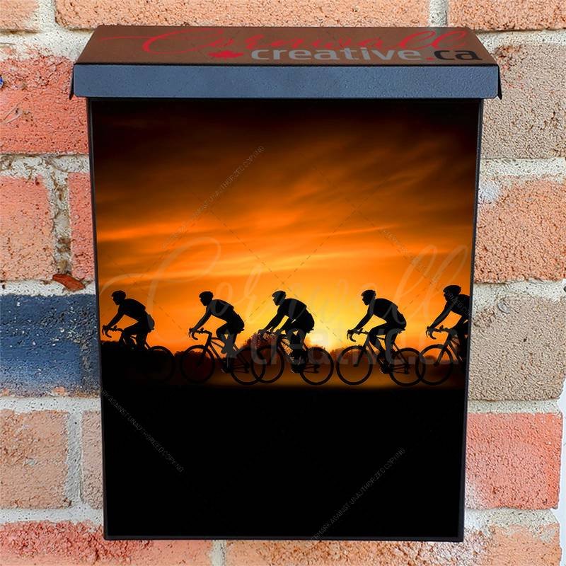 Dress-up your Mailbox and your neighborhood with this brilliant Silhouettes Of Professional Cyclists On Road At Sunset Colonial magnetic or self adhesive vinyl Mailbox Cover. Our magnetic covers feature a complete magnetic surface throughout the entire design, unlike lower-quality options that only incorporate two magnet strips combined with a piece of canvas. This ensures better functionality and a more reliable, stronger hold against the wind, also these covers have an additional UV protection, so your covers will not fade for many years. We offer self-adhesive and magnetic covers with both standard opaque vinyl or reflective vinyl options. The reflective mailbox covers function just like license plates and road signs, ensuring excellent visibility during nighttime. No matter the size of your mailbox, we make covers for all box sizes to suit your needs perfectly!