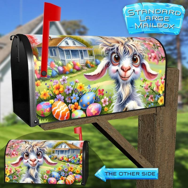 Beautify your Mailbox and your neighborhood with this brilliant Silly Easter Goat curbside / rural / farm magnetic or self adhesive vinyl Mailbox Cover. Our magnetic covers feature a complete magnetic surface throughout the entire design, unlike lower-quality options that only incorporate two magnet strips combined with a piece of canvas. This ensures better functionality and a more reliable, stronger hold against the wind, also these covers have an additional UV protection, so your covers will not fade for many years. We offer self-adhesive and magnetic covers with both standard opaque vinyl or reflective vinyl options. The reflective mailbox covers function just like license plates and road signs, ensuring excellent visibility during nighttime. No matter the size of your mailbox, we make covers for all small, large and jumbo boxes to suit your needs perfectly!