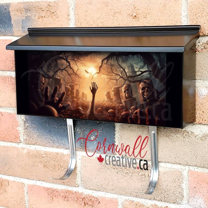 Applying your Skeleton Hand Rising From A Graveyard At Halloween wall-mounted townhouse / ranch mailbox cover it is pretty easy to revamp your mailbox to a special and unique item. These covers require a flat surface, so they work with townhouse / ranch mailboxes that do not have any embossed / debossed decoration or signs. Magnetic mailbox covers work with steel boxes only, for aluminum and plastic boxes we offer the self-adhesive vinyl covers. Also, you can create your custom townhouse / ranch mailbox cover using you own pictures, adding your name, street number, etc. Our magnetic covers feature a complete magnetic surface throughout the entire design, unlike lower-quality options that only incorporate two magnet strips combined with a piece of canvas. This ensures better functionality and a more reliable, stronger hold against the wind, also these covers have an additional UV protection, so your covers will not fade for many years. The reflective mailbox covers function just like license plates and road signs, ensuring excellent visibility during nighttime.