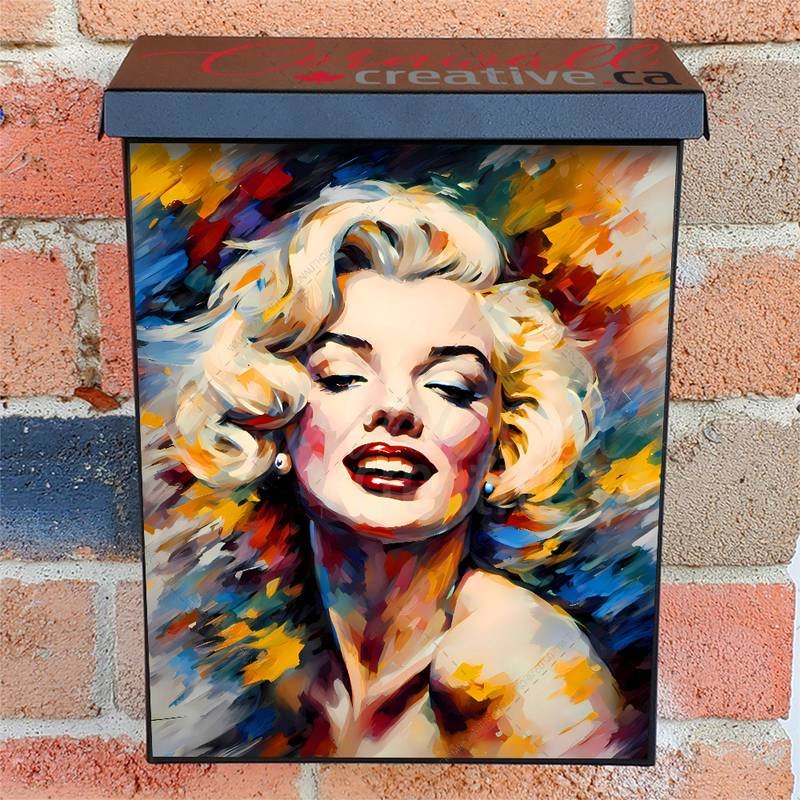 Prettify your Mailbox and your neighborhood with this brilliant Smiling Marilyn Monroe Colonial magnetic or self adhesive vinyl Mailbox Cover. Our magnetic covers feature a complete magnetic surface throughout the entire design, unlike lower-quality options that only incorporate two magnet strips combined with a piece of canvas. This ensures better functionality and a more reliable, stronger hold against the wind, also these covers have an additional UV protection, so your covers will not fade for many years. We offer self-adhesive and magnetic covers with both standard opaque vinyl or reflective vinyl options. The reflective mailbox covers function just like license plates and road signs, ensuring excellent visibility during nighttime. No matter the size of your mailbox, we make covers for all box sizes to suit your needs perfectly!