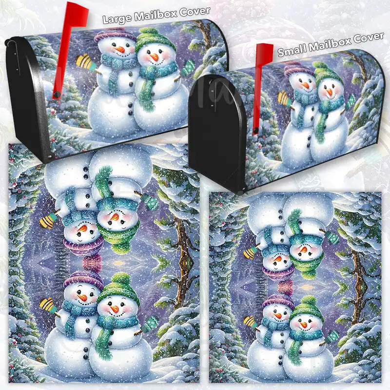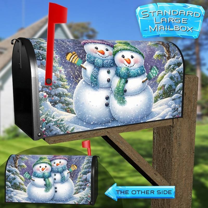 Gussy up your Mailbox and your neighborhood with this brilliant Snowman Couple Greeting curbside / rural / farm magnetic or self adhesive vinyl Mailbox Cover. Our magnetic covers feature a complete magnetic surface throughout the entire design, unlike lower-quality options that only incorporate two magnet strips combined with a piece of canvas. This ensures better functionality and a more reliable, stronger hold against the wind, also these covers have an additional UV protection, so your covers will not fade for many years. We offer self-adhesive and magnetic covers with both standard opaque vinyl or reflective vinyl options. The reflective mailbox covers function just like license plates and road signs, ensuring excellent visibility during nighttime. No matter the size of your mailbox, we make covers for all small, large and jumbo boxes to suit your needs perfectly!