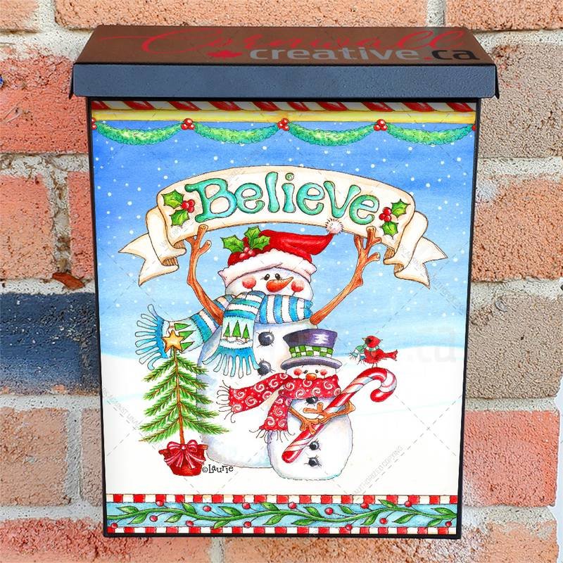 Prettify your Mailbox and your neighborhood with this brilliant Snowmen with a Believe Sign Colonial magnetic or self adhesive vinyl Mailbox Cover. Our magnetic covers feature a complete magnetic surface throughout the entire design, unlike lower-quality options that only incorporate two magnet strips combined with a piece of canvas. This ensures better functionality and a more reliable, stronger hold against the wind, also these covers have an additional UV protection, so your covers will not fade for many years. We offer self-adhesive and magnetic covers with both standard opaque vinyl or reflective vinyl options. The reflective mailbox covers function just like license plates and road signs, ensuring excellent visibility during nighttime. No matter the size of your mailbox, we make covers for all box sizes to suit your needs perfectly!