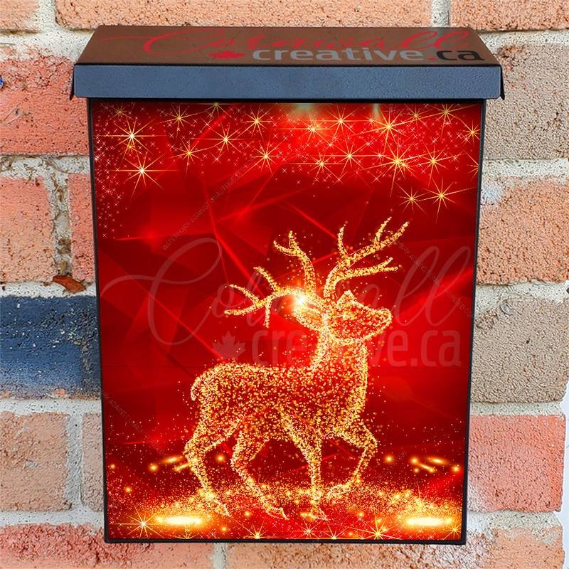 Transform your Mailbox and your neighborhood with this brilliant Sparkling Christmas Reindeer Colonial magnetic or self adhesive vinyl Mailbox Cover. Our magnetic covers feature a complete magnetic surface throughout the entire design, unlike lower-quality options that only incorporate two magnet strips combined with a piece of canvas. This ensures better functionality and a more reliable, stronger hold against the wind, also these covers have an additional UV protection, so your covers will not fade for many years. We offer self-adhesive and magnetic covers with both standard opaque vinyl or reflective vinyl options. The reflective mailbox covers function just like license plates and road signs, ensuring excellent visibility during nighttime. No matter the size of your mailbox, we make covers for all box sizes to suit your needs perfectly!