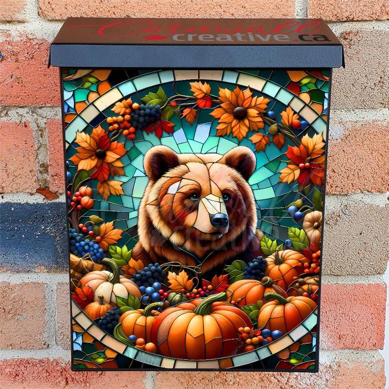 Dress-up your Mailbox and your neighborhood with this brilliant Stained Glass Autumn Bear Colonial magnetic or self adhesive vinyl Mailbox Cover. Our magnetic covers feature a complete magnetic surface throughout the entire design, unlike lower-quality options that only incorporate two magnet strips combined with a piece of canvas. This ensures better functionality and a more reliable, stronger hold against the wind, also these covers have an additional UV protection, so your covers will not fade for many years. We offer self-adhesive and magnetic covers with both standard opaque vinyl or reflective vinyl options. The reflective mailbox covers function just like license plates and road signs, ensuring excellent visibility during nighttime. No matter the size of your mailbox, we make covers for all box sizes to suit your needs perfectly!