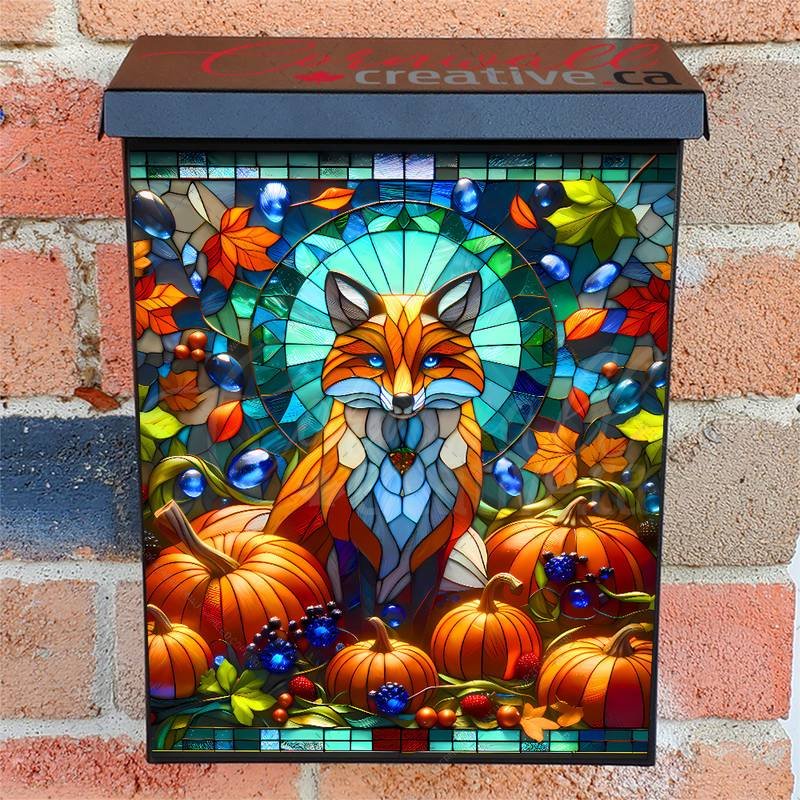 Improve your Mailbox and your neighborhood with this brilliant Stained Glass Autumn Fox Colonial magnetic or self adhesive vinyl Mailbox Cover. Our magnetic covers feature a complete magnetic surface throughout the entire design, unlike lower-quality options that only incorporate two magnet strips combined with a piece of canvas. This ensures better functionality and a more reliable, stronger hold against the wind, also these covers have an additional UV protection, so your covers will not fade for many years. We offer self-adhesive and magnetic covers with both standard opaque vinyl or reflective vinyl options. The reflective mailbox covers function just like license plates and road signs, ensuring excellent visibility during nighttime. No matter the size of your mailbox, we make covers for all box sizes to suit your needs perfectly!