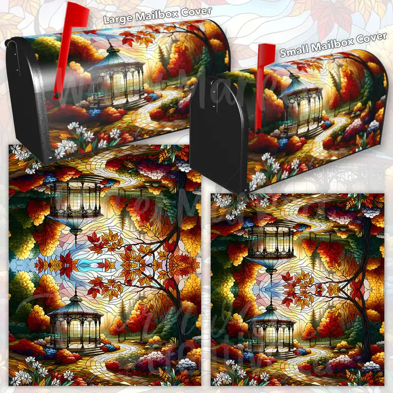 Adorn your Mailbox and your neighborhood with this brilliant Stained Glass Autumn Park Gazebo curbside / rural / farm magnetic or self adhesive vinyl Mailbox Cover. Our magnetic covers feature a complete magnetic surface throughout the entire design, unlike lower-quality options that only incorporate two magnet strips combined with a piece of canvas. This ensures better functionality and a more reliable, stronger hold against the wind, also these covers have an additional UV protection, so your covers will not fade for many years. We offer self-adhesive and magnetic covers with both standard opaque vinyl or reflective vinyl options. The reflective mailbox covers function just like license plates and road signs, ensuring excellent visibility during nighttime. No matter the size of your mailbox, we make covers for all small, large and jumbo boxes to suit your needs perfectly!