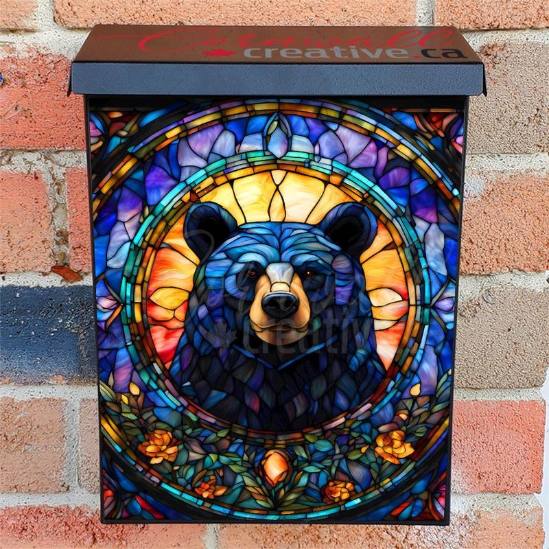 Reform your Mailbox and your neighborhood with this brilliant Stained Glass Bear Portrait Colonial magnetic or self adhesive vinyl Mailbox Cover. Our magnetic covers feature a complete magnetic surface throughout the entire design, unlike lower-quality options that only incorporate two magnet strips combined with a piece of canvas. This ensures better functionality and a more reliable, stronger hold against the wind, also these covers have an additional UV protection, so your covers will not fade for many years. We offer self-adhesive and magnetic covers with both standard opaque vinyl or reflective vinyl options. The reflective mailbox covers function just like license plates and road signs, ensuring excellent visibility during nighttime. No matter the size of your mailbox, we make covers for all box sizes to suit your needs perfectly!