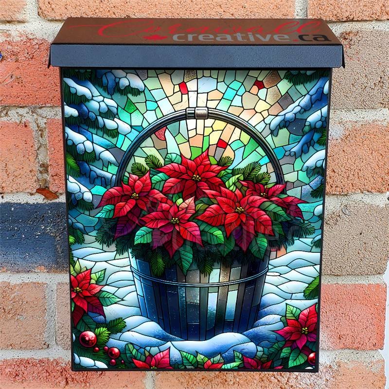 Gussy up your Mailbox and your neighborhood with this brilliant Stained Glass Christmas Poinsettias in a Bucket Colonial magnetic or self adhesive vinyl Mailbox Cover. Our magnetic covers feature a complete magnetic surface throughout the entire design, unlike lower-quality options that only incorporate two magnet strips combined with a piece of canvas. This ensures better functionality and a more reliable, stronger hold against the wind, also these covers have an additional UV protection, so your covers will not fade for many years. We offer self-adhesive and magnetic covers with both standard opaque vinyl or reflective vinyl options. The reflective mailbox covers function just like license plates and road signs, ensuring excellent visibility during nighttime. No matter the size of your mailbox, we make covers for all box sizes to suit your needs perfectly!