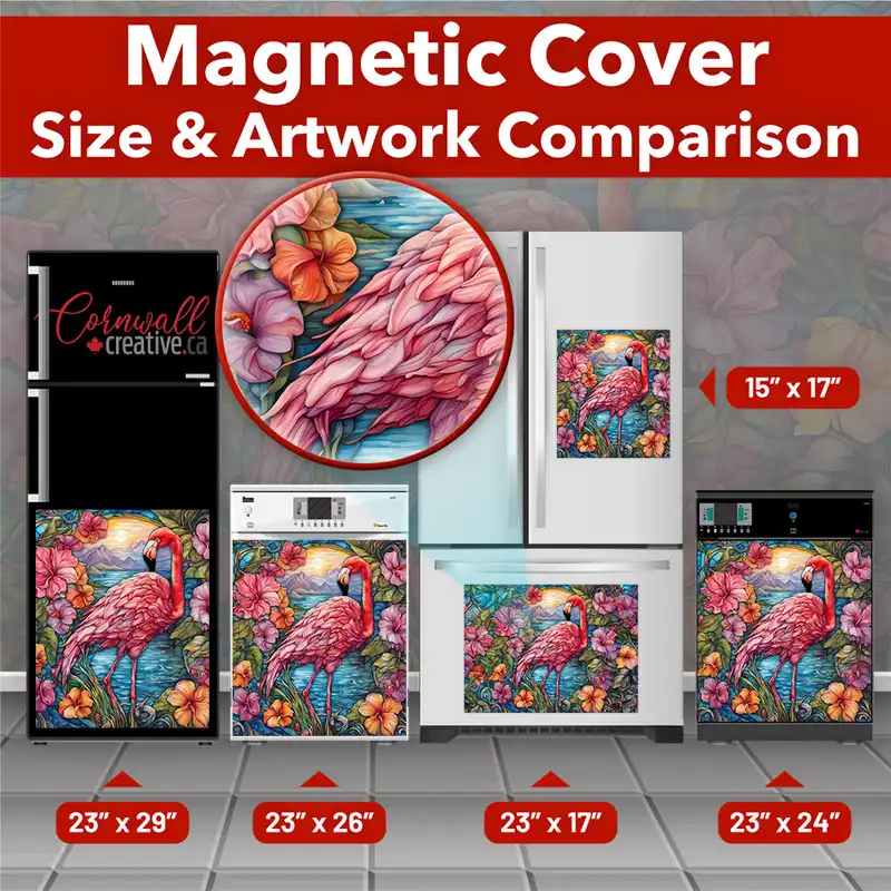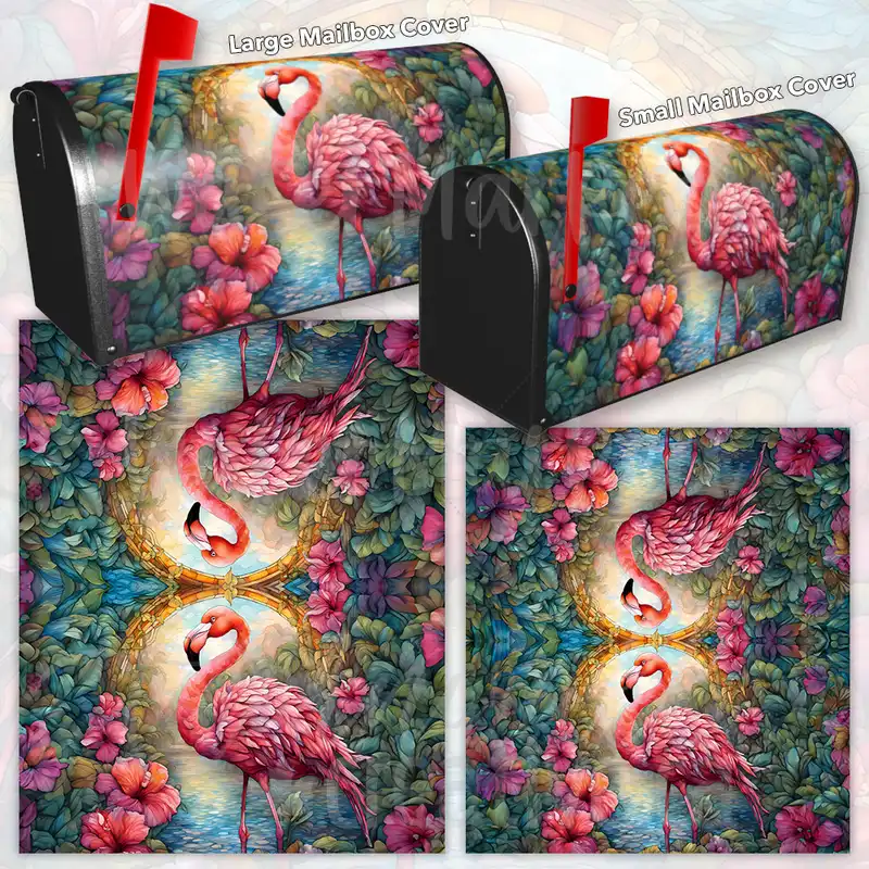 Revamp your Mailbox and your neighborhood with this brilliant Stained Glass Hibiscus and Flamingo curbside / rural / farm magnetic or self adhesive vinyl Mailbox Cover. Our magnetic covers feature a complete magnetic surface throughout the entire design, unlike lower-quality options that only incorporate two magnet strips combined with a piece of canvas. This ensures better functionality and a more reliable, stronger hold against the wind, also these covers have an additional UV protection, so your covers will not fade for many years. We offer self-adhesive and magnetic covers with both standard opaque vinyl or reflective vinyl options. The reflective mailbox covers function just like license plates and road signs, ensuring excellent visibility during nighttime. No matter the size of your mailbox, we make covers for all small, large and jumbo boxes to suit your needs perfectly!