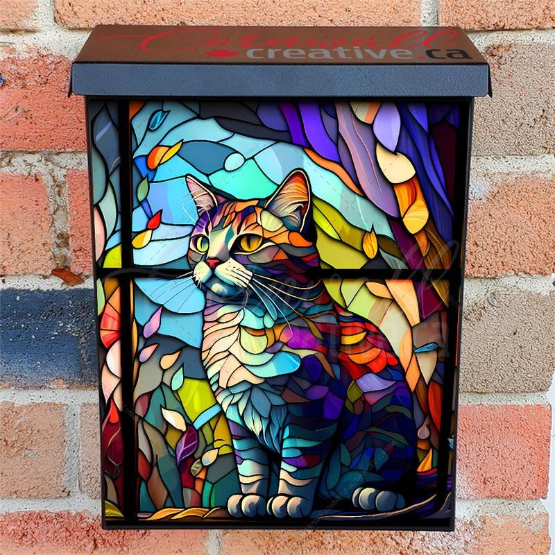 Reform your Mailbox and your neighborhood with this brilliant Stained Glass Kitten Design Colonial magnetic or self adhesive vinyl Mailbox Cover. Our magnetic covers feature a complete magnetic surface throughout the entire design, unlike lower-quality options that only incorporate two magnet strips combined with a piece of canvas. This ensures better functionality and a more reliable, stronger hold against the wind, also these covers have an additional UV protection, so your covers will not fade for many years. We offer self-adhesive and magnetic covers with both standard opaque vinyl or reflective vinyl options. The reflective mailbox covers function just like license plates and road signs, ensuring excellent visibility during nighttime. No matter the size of your mailbox, we make covers for all box sizes to suit your needs perfectly!