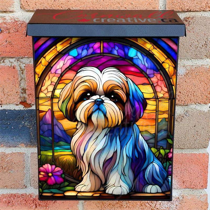 Gild your Mailbox and your neighborhood with this brilliant Stained Glass Shih Tzu and Flowers Colonial magnetic or self adhesive vinyl Mailbox Cover. Our magnetic covers feature a complete magnetic surface throughout the entire design, unlike lower-quality options that only incorporate two magnet strips combined with a piece of canvas. This ensures better functionality and a more reliable, stronger hold against the wind, also these covers have an additional UV protection, so your covers will not fade for many years. We offer self-adhesive and magnetic covers with both standard opaque vinyl or reflective vinyl options. The reflective mailbox covers function just like license plates and road signs, ensuring excellent visibility during nighttime. No matter the size of your mailbox, we make covers for all box sizes to suit your needs perfectly!