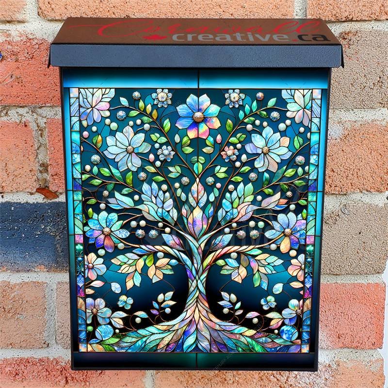 Revamp your Mailbox and your neighborhood with this brilliant Stained Glass Spring Tree 2 Colonial magnetic or self adhesive vinyl Mailbox Cover. Our magnetic covers feature a complete magnetic surface throughout the entire design, unlike lower-quality options that only incorporate two magnet strips combined with a piece of canvas. This ensures better functionality and a more reliable, stronger hold against the wind, also these covers have an additional UV protection, so your covers will not fade for many years. We offer self-adhesive and magnetic covers with both standard opaque vinyl or reflective vinyl options. The reflective mailbox covers function just like license plates and road signs, ensuring excellent visibility during nighttime. No matter the size of your mailbox, we make covers for all box sizes to suit your needs perfectly!