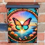 Adorn your Mailbox and your neighborhood with this brilliant Stained Glass Sunset Butterfly Colonial magnetic or self adhesive vinyl Mailbox Cover. Our magnetic covers feature a complete magnetic surface throughout the entire design, unlike lower-quality options that only incorporate two magnet strips combined with a piece of canvas. This ensures better functionality and a more reliable, stronger hold against the wind, also these covers have an additional UV protection, so your covers will not fade for many years. We offer self-adhesive and magnetic covers with both standard opaque vinyl or reflective vinyl options. The reflective mailbox covers function just like license plates and road signs, ensuring excellent visibility during nighttime. No matter the size of your mailbox, we make covers for all box sizes to suit your needs perfectly!