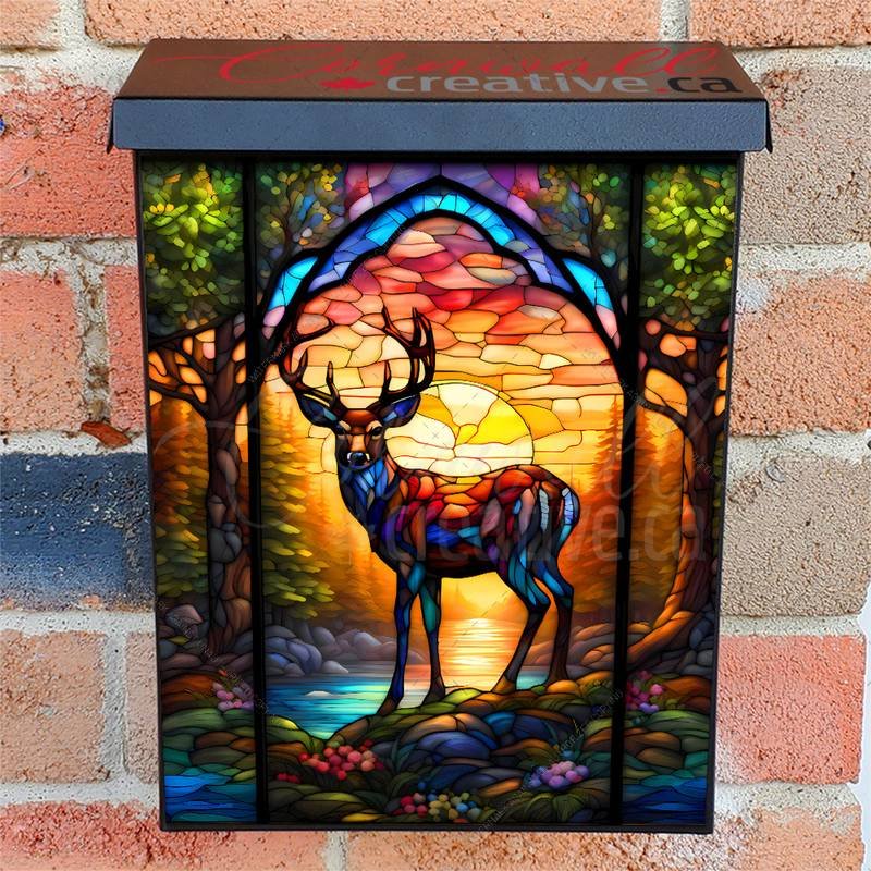 Prettify your Mailbox and your neighborhood with this brilliant Stained Glass Woodland Deer Colonial magnetic or self adhesive vinyl Mailbox Cover. Our magnetic covers feature a complete magnetic surface throughout the entire design, unlike lower-quality options that only incorporate two magnet strips combined with a piece of canvas. This ensures better functionality and a more reliable, stronger hold against the wind, also these covers have an additional UV protection, so your covers will not fade for many years. We offer self-adhesive and magnetic covers with both standard opaque vinyl or reflective vinyl options. The reflective mailbox covers function just like license plates and road signs, ensuring excellent visibility during nighttime. No matter the size of your mailbox, we make covers for all box sizes to suit your needs perfectly!
