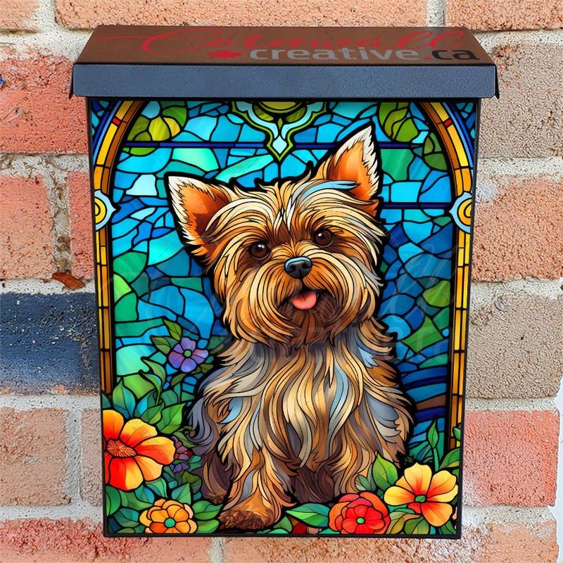 Develop your Mailbox and your neighborhood with this brilliant Stained Glass Yorkie Design Colonial magnetic or self adhesive vinyl Mailbox Cover. Our magnetic covers feature a complete magnetic surface throughout the entire design, unlike lower-quality options that only incorporate two magnet strips combined with a piece of canvas. This ensures better functionality and a more reliable, stronger hold against the wind, also these covers have an additional UV protection, so your covers will not fade for many years. We offer self-adhesive and magnetic covers with both standard opaque vinyl or reflective vinyl options. The reflective mailbox covers function just like license plates and road signs, ensuring excellent visibility during nighttime. No matter the size of your mailbox, we make covers for all box sizes to suit your needs perfectly!