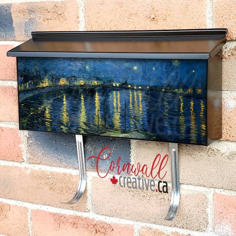 Applying your Starry Night Over the Rhone by V. Gogh wall-mounted townhouse / ranch mailbox cover it is pretty easy to glamorize your mailbox to a special and unique item. These covers require a flat surface, so they work with townhouse / ranch mailboxes that do not have any embossed / debossed decoration or signs. Magnetic mailbox covers work with steel boxes only, for aluminum and plastic boxes we offer the self-adhesive vinyl covers. Also, you can create your custom townhouse / ranch mailbox cover using you own pictures, adding your name, street number, etc. Our magnetic covers feature a complete magnetic surface throughout the entire design, unlike lower-quality options that only incorporate two magnet strips combined with a piece of canvas. This ensures better functionality and a more reliable, stronger hold against the wind, also these covers have an additional UV protection, so your covers will not fade for many years. The reflective mailbox covers function just like license plates and road signs, ensuring excellent visibility during nighttime.