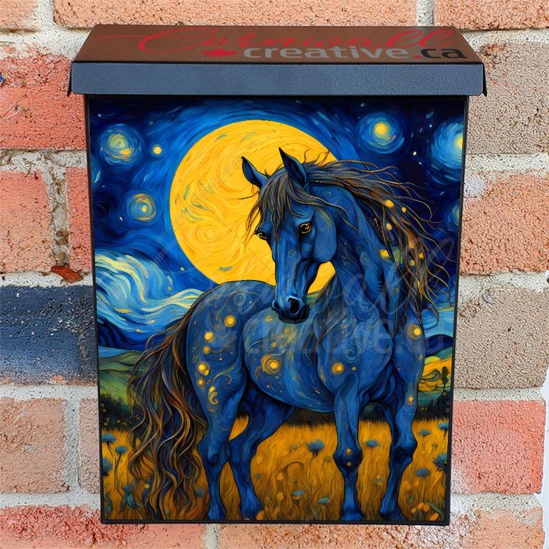 Glamorize your Mailbox and your neighborhood with this brilliant Starry Night Stallion Colonial magnetic or self adhesive vinyl Mailbox Cover. Our magnetic covers feature a complete magnetic surface throughout the entire design, unlike lower-quality options that only incorporate two magnet strips combined with a piece of canvas. This ensures better functionality and a more reliable, stronger hold against the wind, also these covers have an additional UV protection, so your covers will not fade for many years. We offer self-adhesive and magnetic covers with both standard opaque vinyl or reflective vinyl options. The reflective mailbox covers function just like license plates and road signs, ensuring excellent visibility during nighttime. No matter the size of your mailbox, we make covers for all box sizes to suit your needs perfectly!
